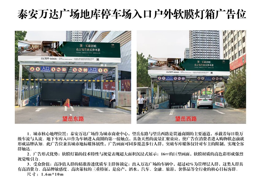 萬達地庫入口戶外燈箱廣告萬達地庫入口軟膜燈箱廣告 泰安萬達望岳西路停車場入口 泰安萬達望岳東路停車場入口 尺寸:寬10*高1.6米 價格:20000元/塊/月 媒體優(yōu)勢: 1、城市核心地理位置:泰安萬達廣場作為城市商業(yè)中心,望岳東路與望岳西路是貫通商圈的主要通道,承載著每日數(shù)萬級車流與入流。地下車庫人口作為車輛進入商圈的**接觸點,具備天然的流量匯聚效應,使廣告在消費者進人購物狀態(tài)前*形成品*認知。此廣告位兼具城市地標媒體屬性,廣告畫面可同步覆蓋步行人群,突破車庫媒體僅針對車主的限制,實現(xiàn)*客群觸達。 2、廣告形式優(yōu)勢:軟膜燈箱的技術特性與視覺表現(xiàn)*大面積沉浸式展示:16m的*型畫面,軟膜材質的高色彩形成*烈視覺吸引力。 3、受眾價值:高凈值人群的精準滲透優(yōu)質車主群體鎖定:出人萬達廣場的車輛中,*過42%為管理層人群,這類人群具有高消費力、高品*敏感度、高決策權的三重特征,是房產(chǎn),酒水,汽車、金融、旅游,奢侈品等*行業(yè)的核心目標客群。 下一篇中南財源門樓體霓虹燈廣告 |